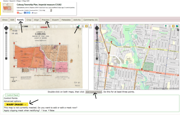 4. Once you've chosen a map from the list by clicking on its title click the rectify tab. This will bring up a split screen with your historical map image on the left and a mapping tool on the right. Please note, you’ll only see the rectify tab if you have logged in! You'll notice that each frame has the standard web map navigation controls. Now you can begin matching locations on the historical map image with coordinates on the web mapping tool. Click the map pin icon and mark a pair of corresponding points on both maps then click add control point. If you don’t click add control point your points won’t be saved! For best results, you should add at least four pairs of control points. Adding points to street intersections or railway crossings is an easy way to rectify a map. Once you have added at least four pairs of control points click on the Warp Image button. This is very important. To see your rectified map click the preview tab.