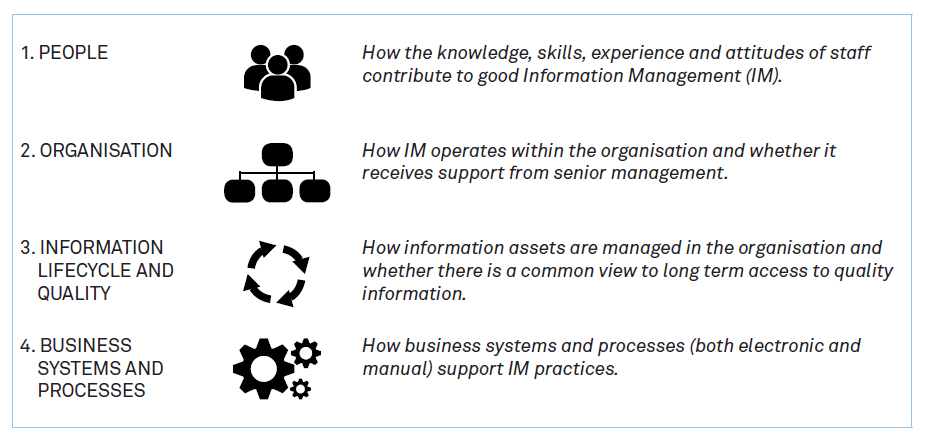 The program requires participants to self-assess their Information Management maturity using the IM3 tool and then send their results to PROV. The IM3 tool is composed of a self-assessment questionnaire focused around four key dimensions: