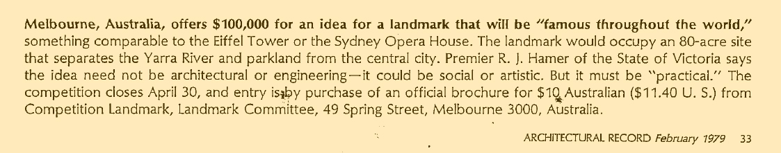 The 1979 Melbourne Landmark Competition was purely about ideas. Biographies, conceptual statements and background information were not required. In fact, in this contest run by the Victorian Government, any detail that might give away the entrant’s identity was strictly forbidden. The designs from world famous architects were in theory, supposed to sit alongside those from local school children, and each would be evaluated purely on face value, without bias.