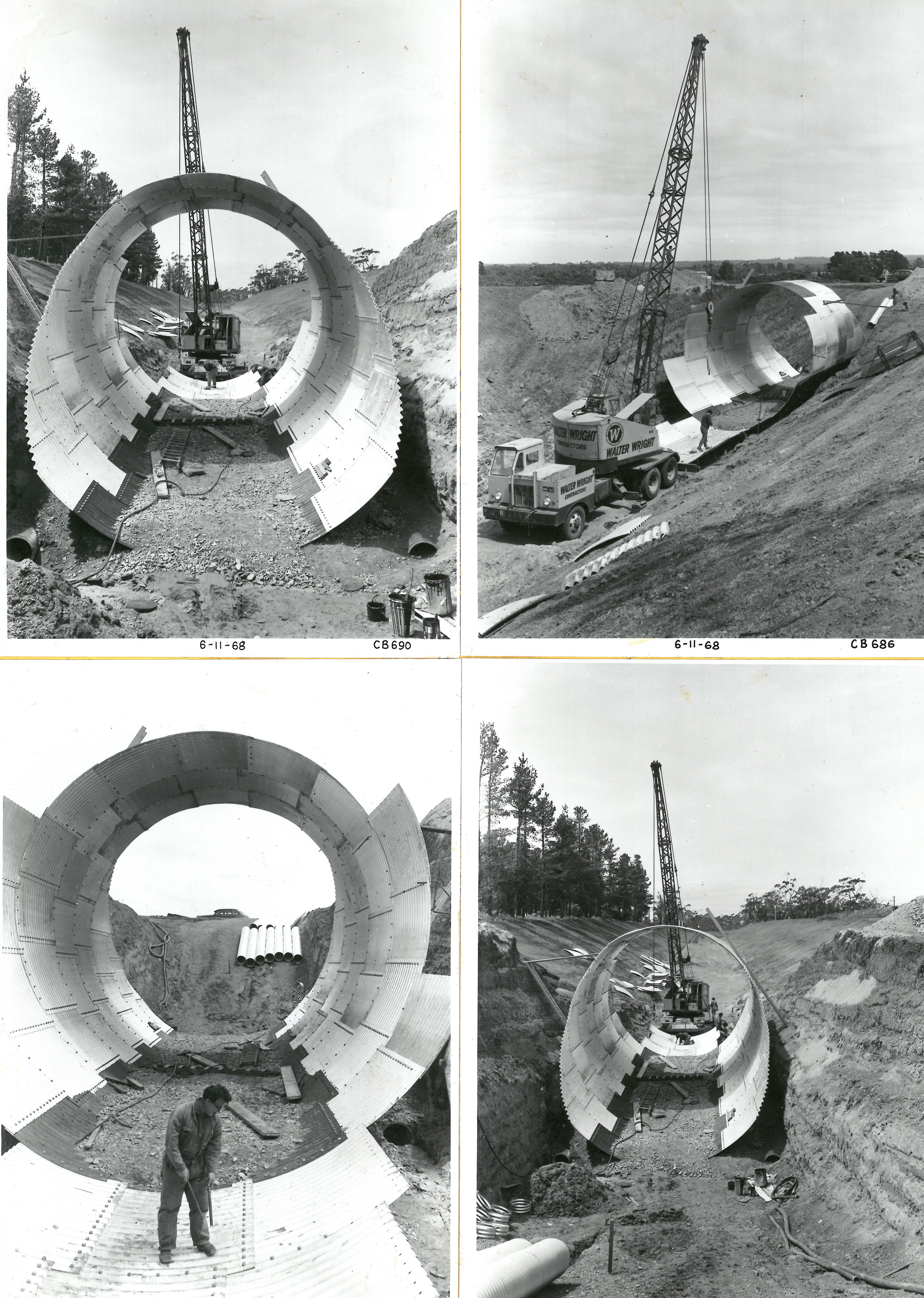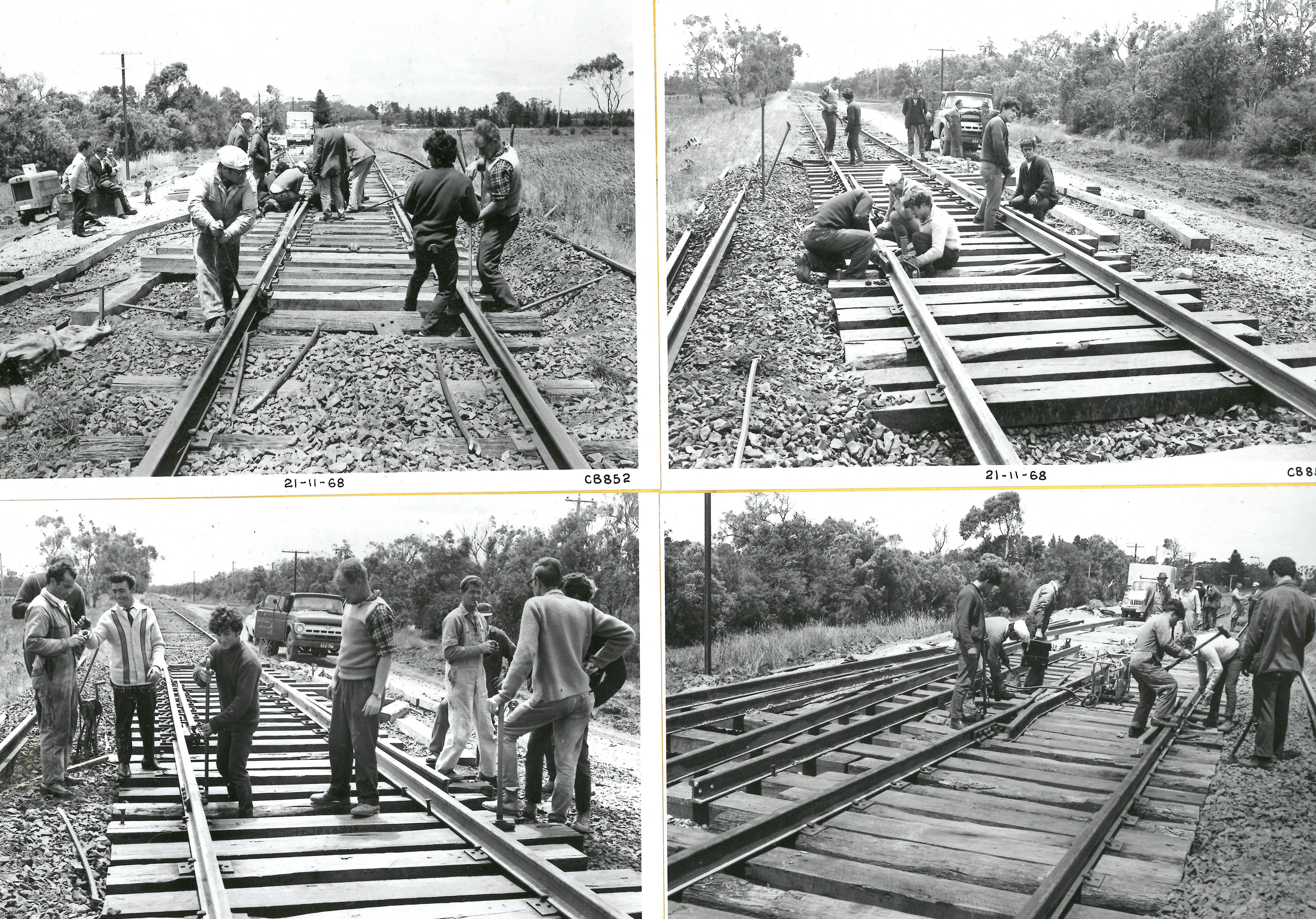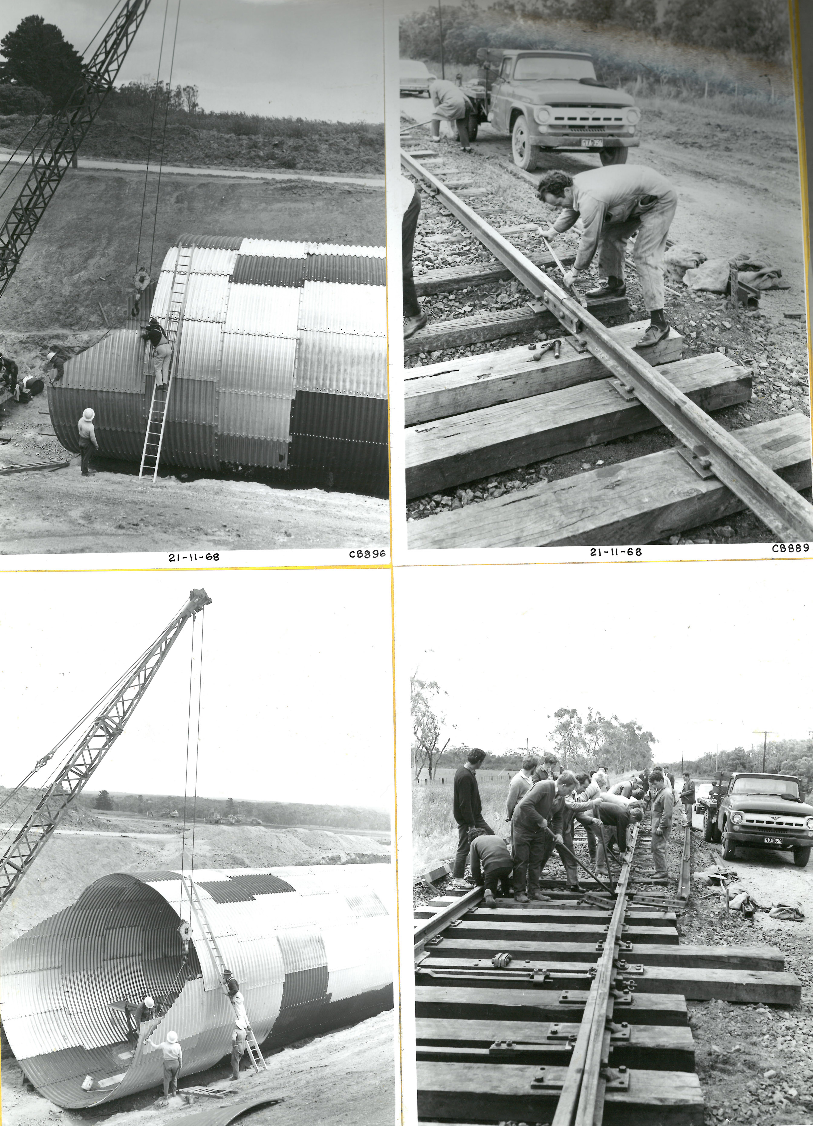 The October transfer of records included an album of photographs of the construction of the Tyabb to Long Island Railway in 1968. The photographs display a method of creating a short railway tunnel out of partitioned corrugated steel that is bolted together which is then backfilled and covered over. It also includes photographs of a rail laying gang laying sections of the track.
