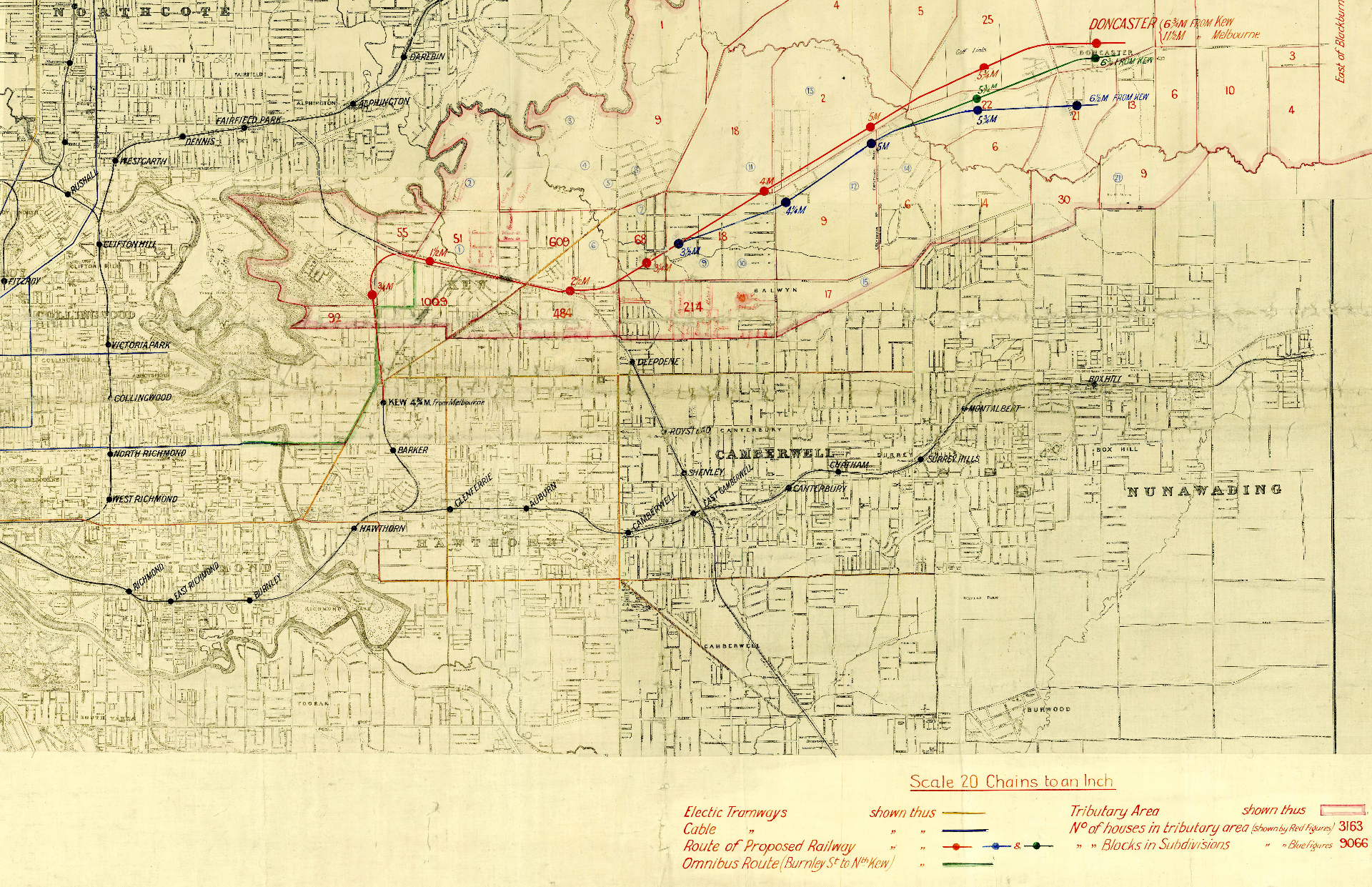 In 1928, a railway line to Doncaster received the endorsement of a key Victorian parliamentary committee. The Parliamentary Standing Committee on Railways in its report concluded ‘that it is expedient to construct a railway line from Kew to Doncaster’.[1] A number of similar proposals had been raised at intervals as far back as 1890, beginning with a proposal to build an extension from the existing railway line at Canterbury station.[2] In a report to the Victorian Parliament in 1908, the Railways Standing Committee considered the possibility of a line extending from Victoria Park, through Yarra Bend and the Kew Asylum grounds but concluded that it was not economically viable, and there were not enough residents to justify the financial losses that would be incurred. Another committee report delivered to parliament in July 1925 considered a route from Camberwell station, via East Camberwell and Deepdene to East Doncaster. Again the conclusion was that the economic case was not strong enough and that it was ‘not expedient’ to construct the line at that time.[3] The change of heart only a few years later was partly due to several years of sustained rapid population growth; Melbourne in 1928 was nearing 1 million, nearly double its population in 1900.[4]