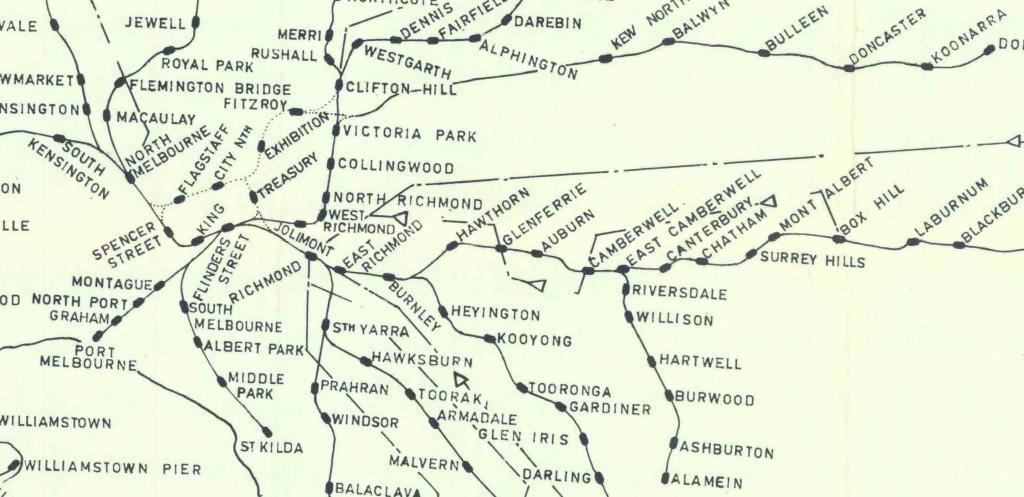 When it came time to build the loop in the early 1970s, this plan for a one-way peak hour traffic rail tunnel extending from the loop to the freeway was the first part of the proposed railway to be officially ruled out. The reasoning was that making provision for a junction to the underground loop would be a costly engineering complication, and that a one-way tunnel (inward in the morning, outward in the afternoon) with only one station offered very minimal benefits to commuters and the rail network. In addition, the proposal was originally conceived as part of an underground extension of the Eastern Freeway through Carlton and North Melbourne, with the railway line in the middle until Nicholson Street. And so it was decided that if the Doncaster line was going to be built, all trains would only use the existing tracks through Jolimont, Richmond and Collingwood with a junction just north of Victoria Park station, possibly with the addition of a third set of tracks to deal with increased peak hour traffic to and from the city.
