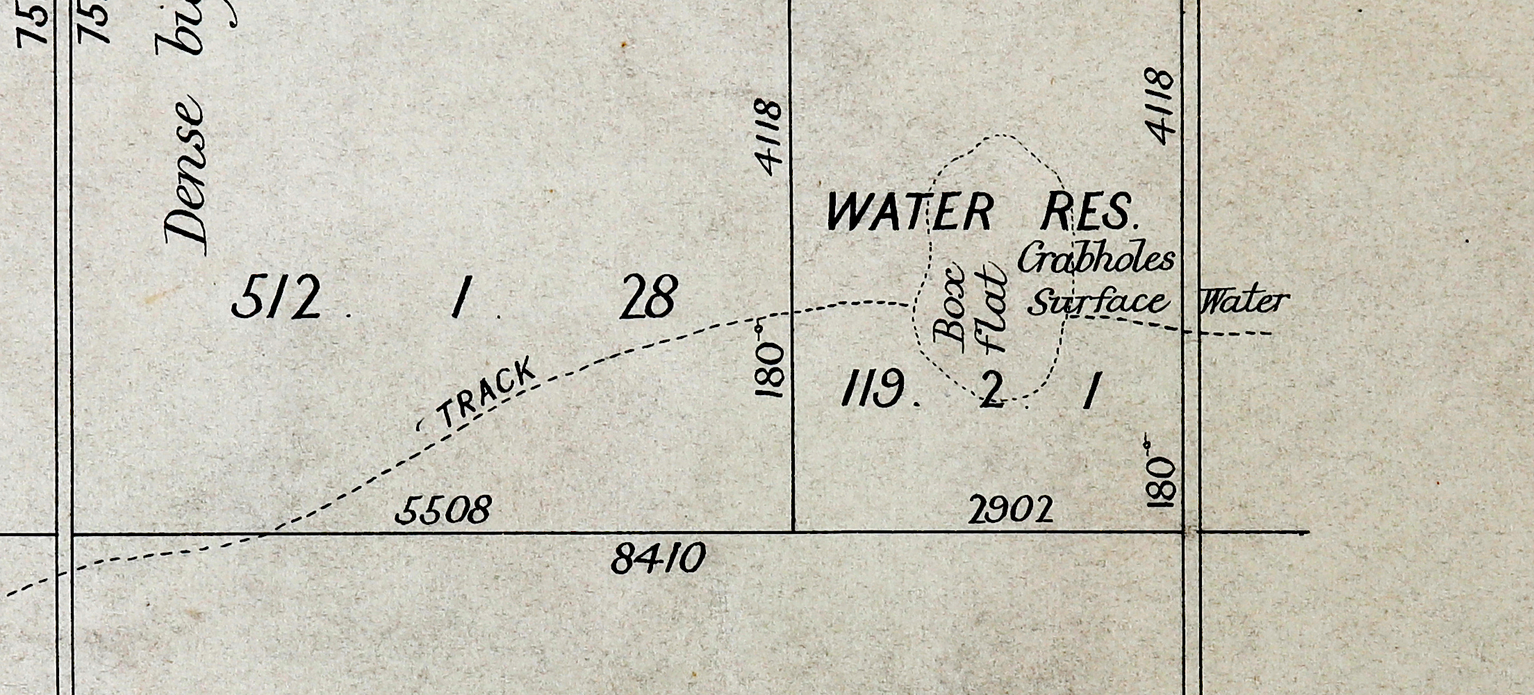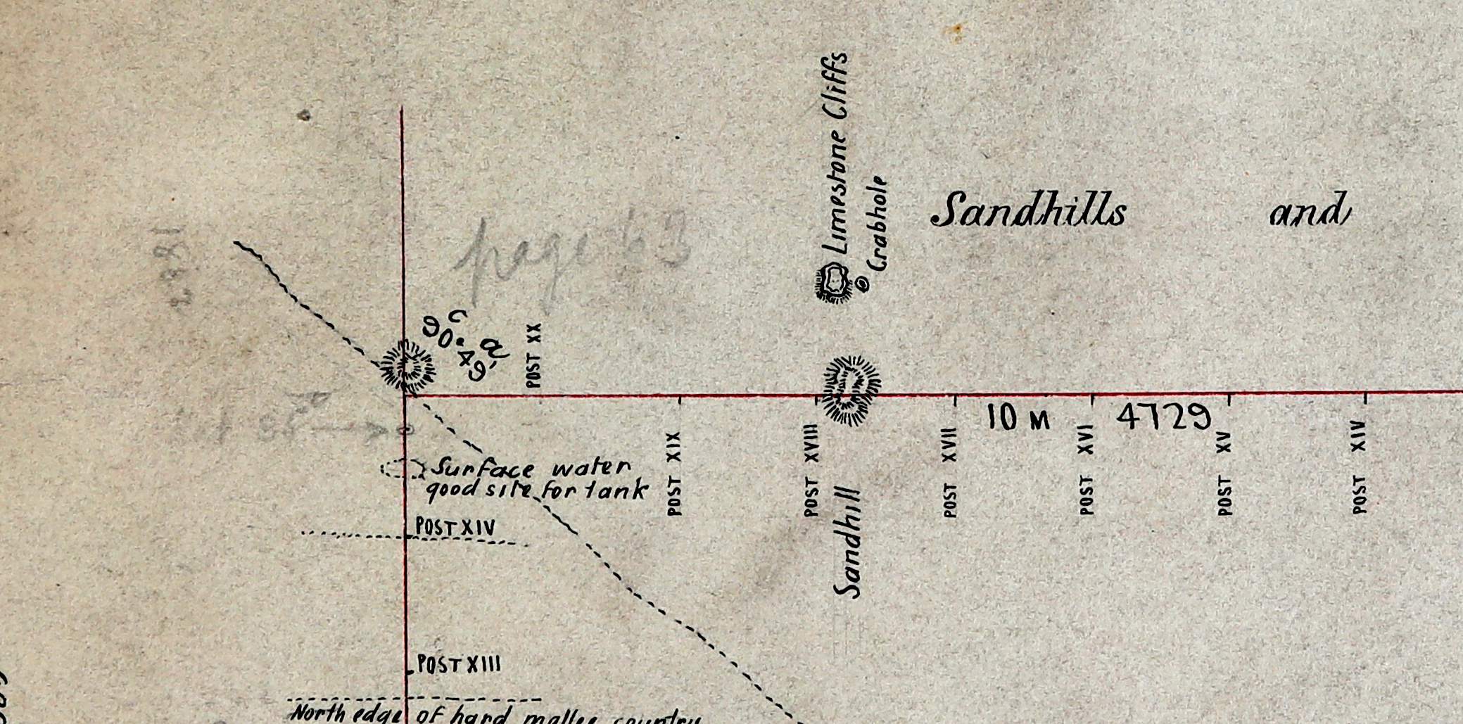 More problematic and difficult to explain are the three plains—one to the north (partly obscured by the word ‘AND’), one to the west of the Log Tank and one to the south-west of the dune—that surround the ‘U’ shaped dune. Each is labelled as grassy. The northernmost plain is simply labelled ‘Grass’, that to the south-west is labelled ‘Grassy Flat’ and that to the west is labelled ‘Good Red Sandy Loam OPEN PLAIN Good Spear Grass’. These plains raise the question, referred to earlier, of whether they are natural or human artefacts, and, if they are human artefacts, of who created them. There is no evidence of these grassy plains in the area today, though the plain in the dune basin remains untouched and apparently agriculturally unusable. The land where the grassy plains were located now seems indistinguishable from that around it, suggesting those plains might not have been the product of different or poorer soil types. The notes on the map reinforce this conclusion and the surveyor seems to have been at pains to point this out. In labelling the western plain ‘Good Red Sandy Loam’, he made it clear that the soil was the same as the surrounding area, which he described as ‘Good Red Loam’. Perhaps the surveyor also pondered how the plains came to be there.