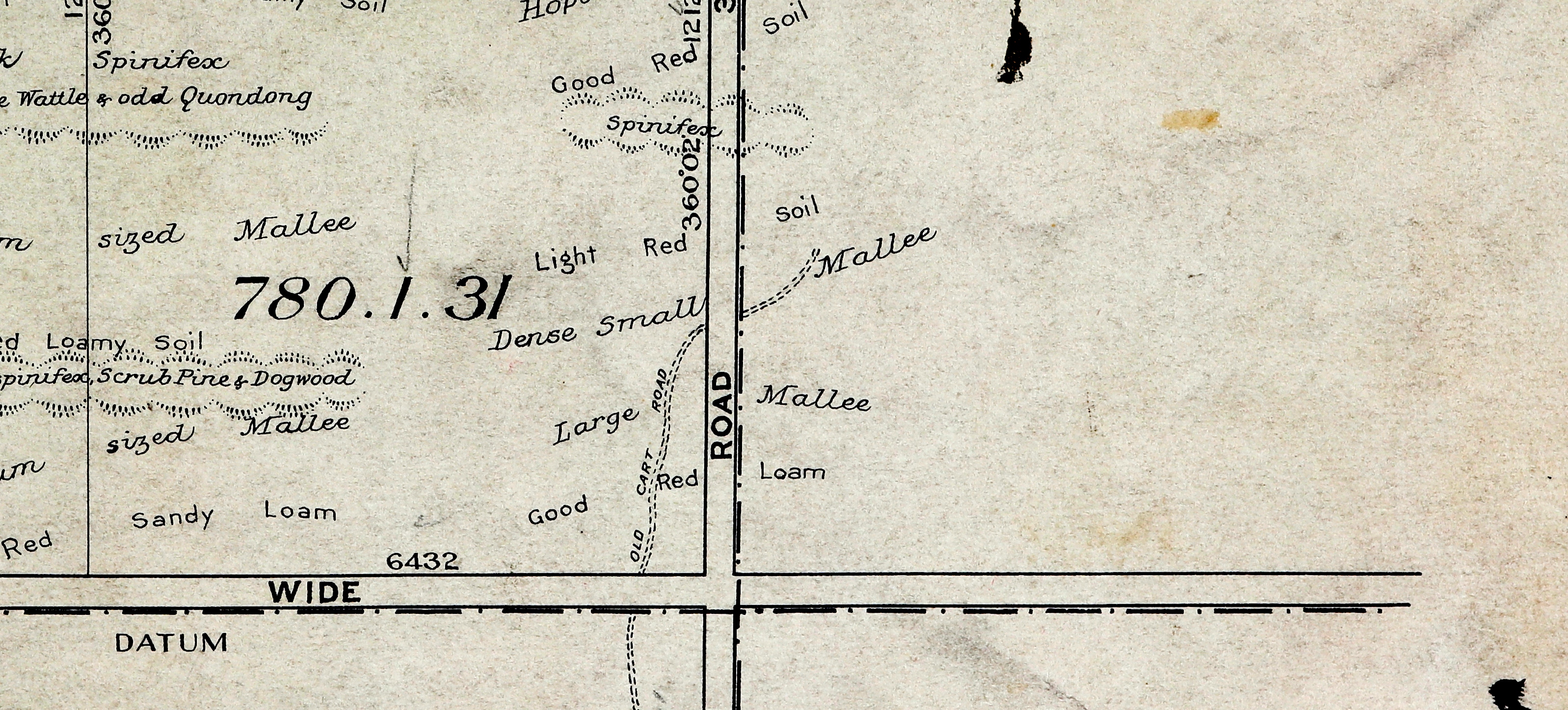 The record plans do not automatically recommend themselves as sources of information about Aboriginal land use in the Mallee. They appear to have two significant limitations, namely contemporaneity and geographical scope. Land ownership, and the consequential making of cadastral parish plans in the Mallee, is primarily associated with the agricultural settlement that commenced decades after the original colonial occupation of the land. Pastoral squatters moved onto the Mallee in the 1840s and 1850s, but agricultural settlement only commenced in the southern Mallee in the early 1890s and continued until the 1920s.[48] The passage of that amount of time between the arrival and agricultural settlement of Europeans could reasonably be presumed to have removed evidence of Aboriginal land use. The second apparent limitation is geographical scope. Large parts of the Mallee, such as the Sunset Country and the Big Desert, have never been settled and, hence, have never needed cadastral mapping. The area involved is extensive. The Murray–Sunset National Park alone is over 600,000 hectares (1.5 million acres). The expectation would be that record plans would add little to our knowledge of those areas.