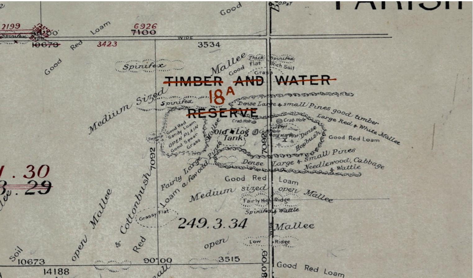 This history of light land use, which is not uncommon in the Mallee back country, increases the theoretical possibility that evidence of Aboriginal land use could have been preserved and recorded when the area was mapped 60 years after its Aboriginal owners were dispossessed. Analysis confirms that possibility, and this plan of an island of tall green trees with associated water in a sea of mallee, preserves evidence of three layers of land use. The first layer, showing clearly the original Aboriginal use of the land, is evidenced by three ‘crab holes’ surrounding the swamp in the basin of the ‘U’ shaped dune. These crabholes probably only survived until 1911 because of the limited colonial use of the area. The second layer is the ‘Old Log Tank’, a colonial artefact probably dating to Kulkyne Station’s illegal use of the land. (Incidentally, the post marked ‘X’ in the middle of the plain is probably from Nankivell’s survey of grazing block boundaries in 1883.) The third layer, agricultural settlement, is marked by the new roads, farm boundaries and the declaration of a timber and water reserve to control the use of those valuable resources.