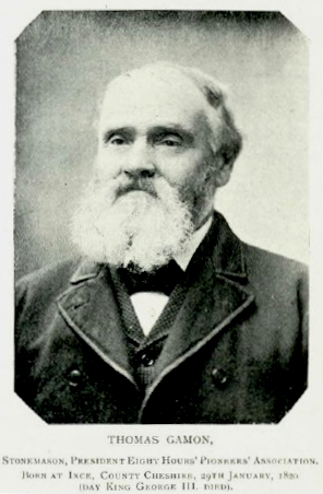 Figure 1: Thomas Gamon (1820–1908), c. 1896, stonemason, member of the Operative Stonemason’s Society and president of the Eight Hours’ Pioneers Association. Source: WE Murphy, History of the eight hours' movement, Spectator Publishing Company, Melbourne, 1896, pp. 61, 80a.