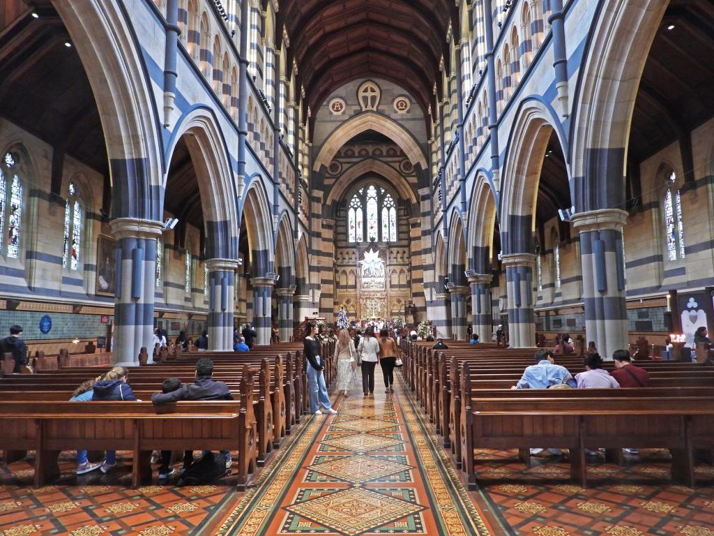 Figure 6: St Paul’s Cathedral, Melbourne, showing the Malmsbury Bluestone in the banded walls and columns. Photograph John Walter, 2023.