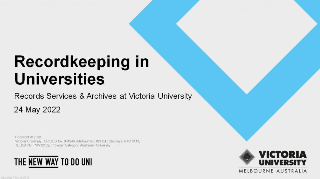 Summary of presentation: Kathryn Hore, Deakin's University Information Manager, discusses recordkeeping in the university sector during COVID-19 including the challenges and opportunities that arose for Deakin's recordkeeping and archives.