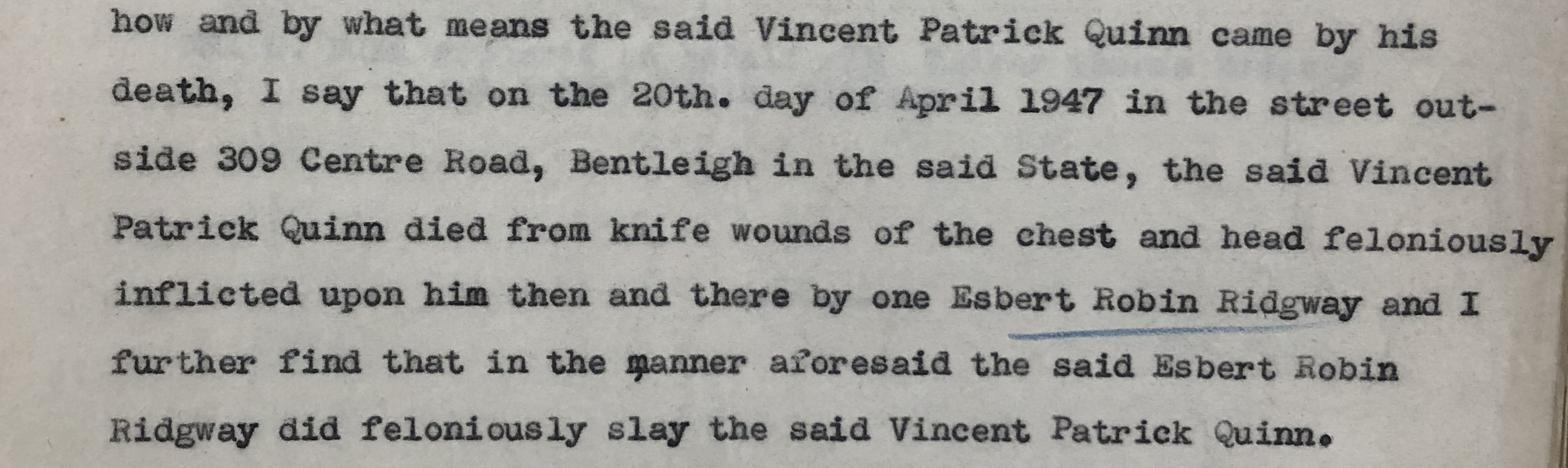 Also among the January openings is the 1947 capital case file of Esbert Ridgway who, in a scuffle outside a Bentleigh hamburger shop pulled a knife on Vincent Quinn, killing him in front of a crowd of late night diners.